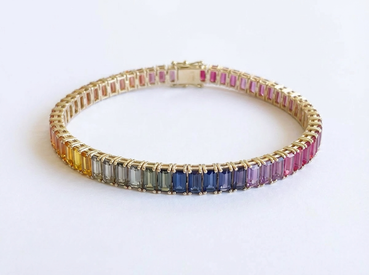 Make a statement with the Emerald Shape Lab Sapphire Tennis Bracelet. A fresh and vibrant twist on the classic tennis bracelet. This ombre gradient bracelet is crafted with emerald-cut lab sapphires. Creating a breathtaking display of color in a graduating rainbow pattern.