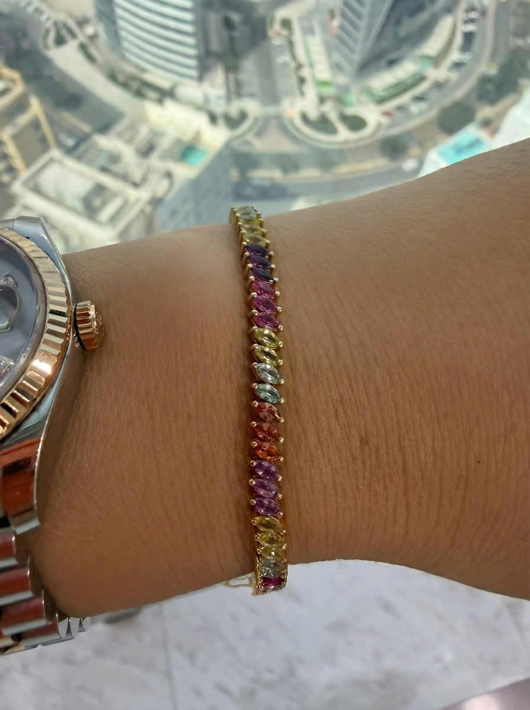 The Design: A unique design where each sapphire is meticulously arranged by hand to create a seamless rainbow ombré gradient that flows beautifully across the bracelet.
