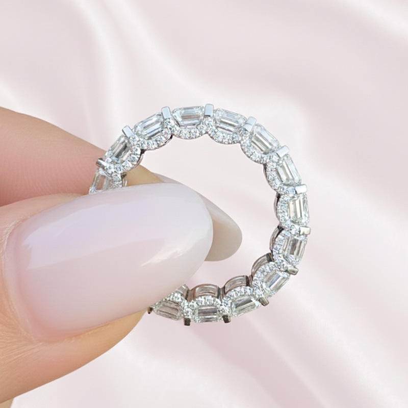 - The Design: A full eternity band. We set each emerald-cut diamond side-by-side for a continuous, brilliant display of light.