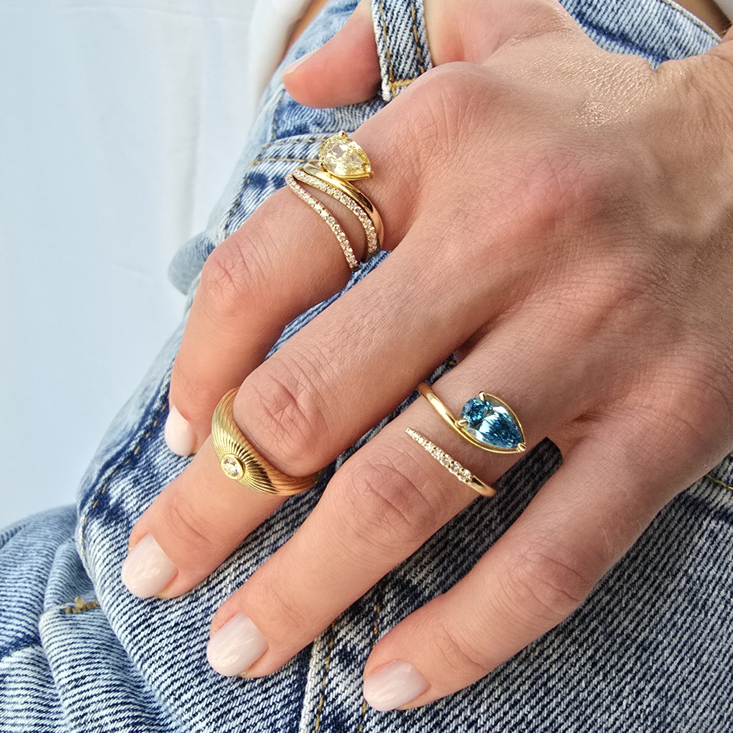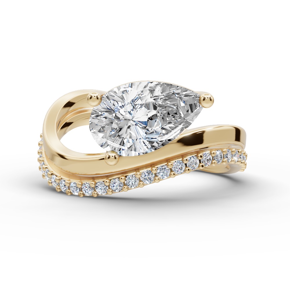 Crafted in 18K yellow gold, the ring features a vivid pear cut diamond, glowing with warmth and intensity. A detachable pavé diamond band adds versatility, allowing the piece to be worn as a bold duo or as two elegant standalone rings. The pavé band is adorned with 0.10CT white diamonds, adding refined brilliance to the design. Total gold weight approx. 2.5gr.