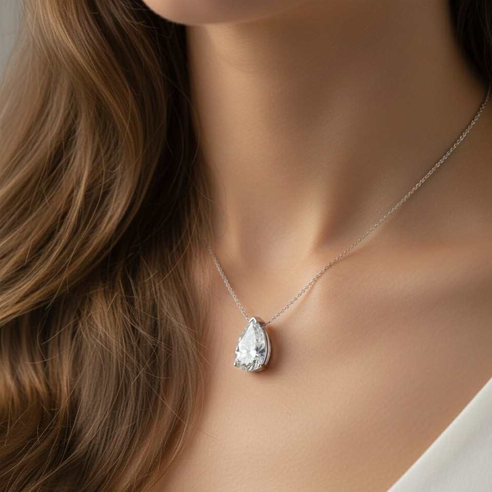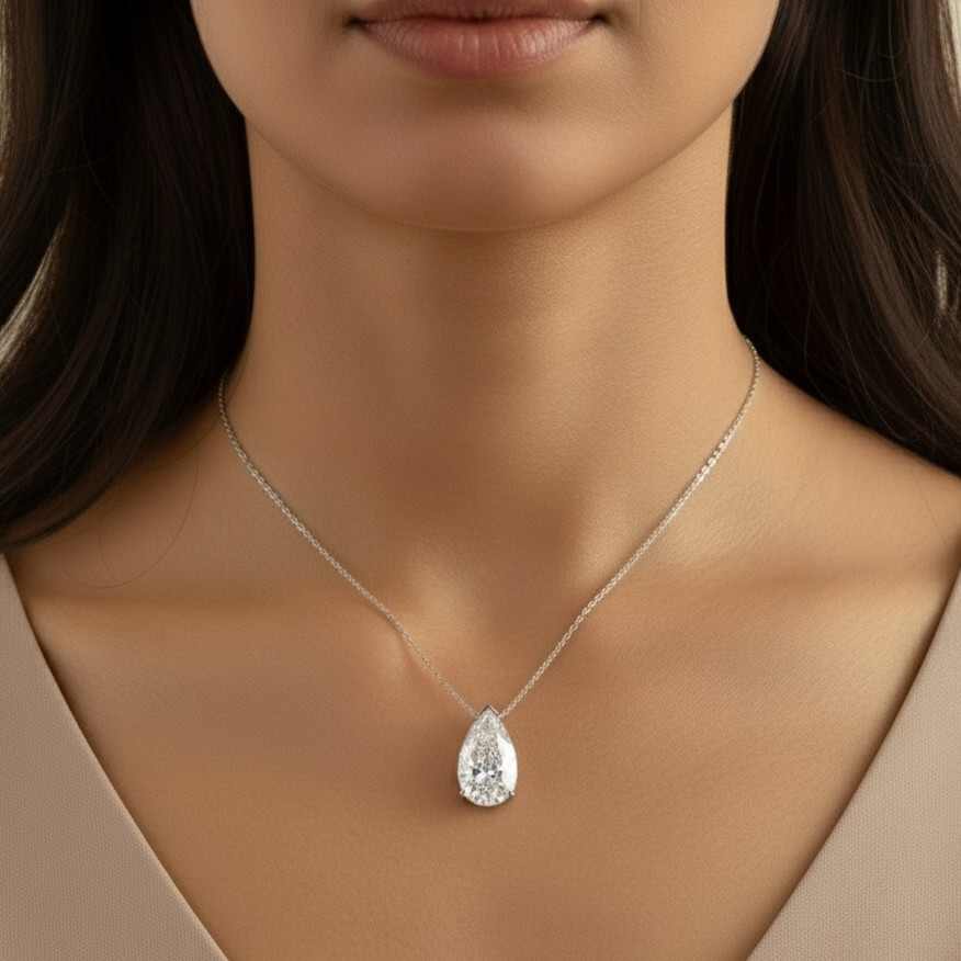 Celebrate life’s most brilliant moments with this breathtaking Pear Diamond & Gold Necklace. We designed this stunning piece as the ultimate symbol of timeless love and elegance, featuring a magnificent 5-carat pear-shaped diamond as its singular, radiant focus. Indeed, this necklace strikes the perfect balance between classic sophistication and modern, conscious luxury. It is, above all, a treasure designed to stand out and be cherished for a lifetime.